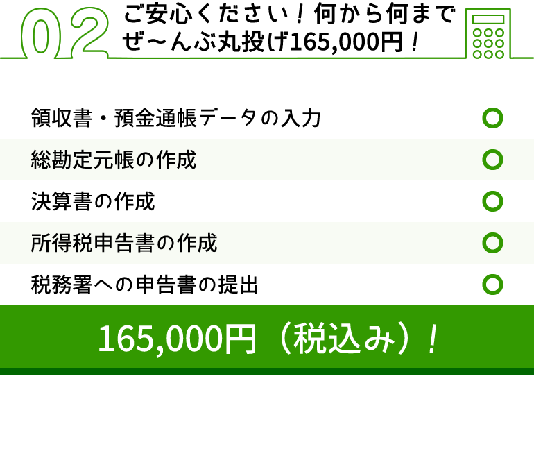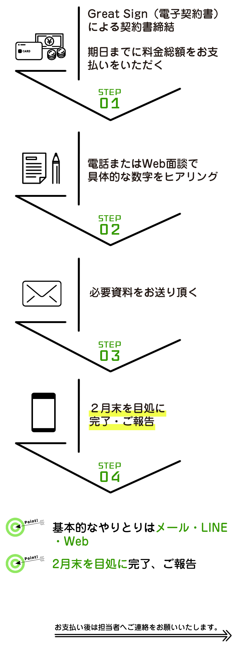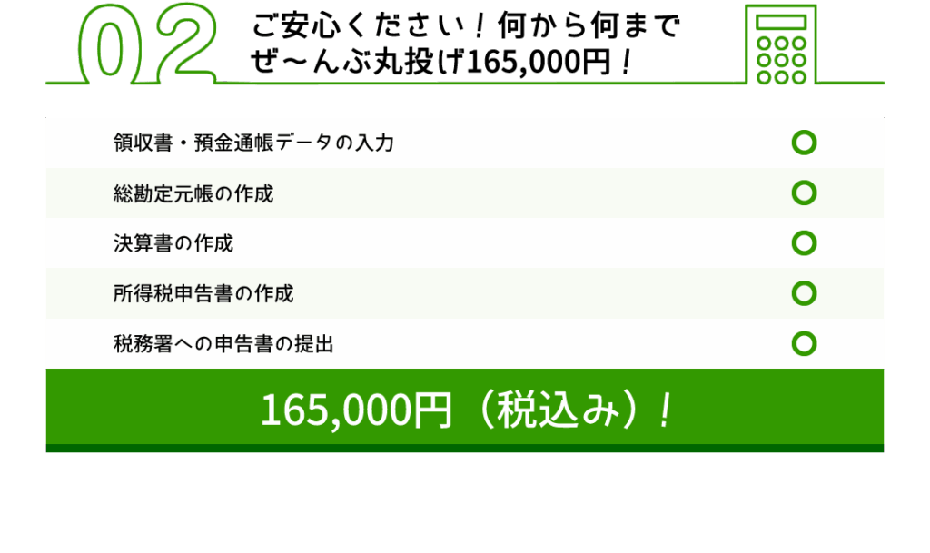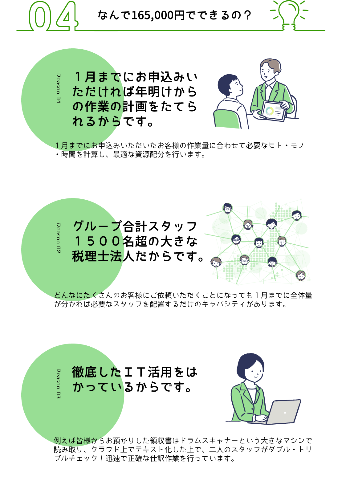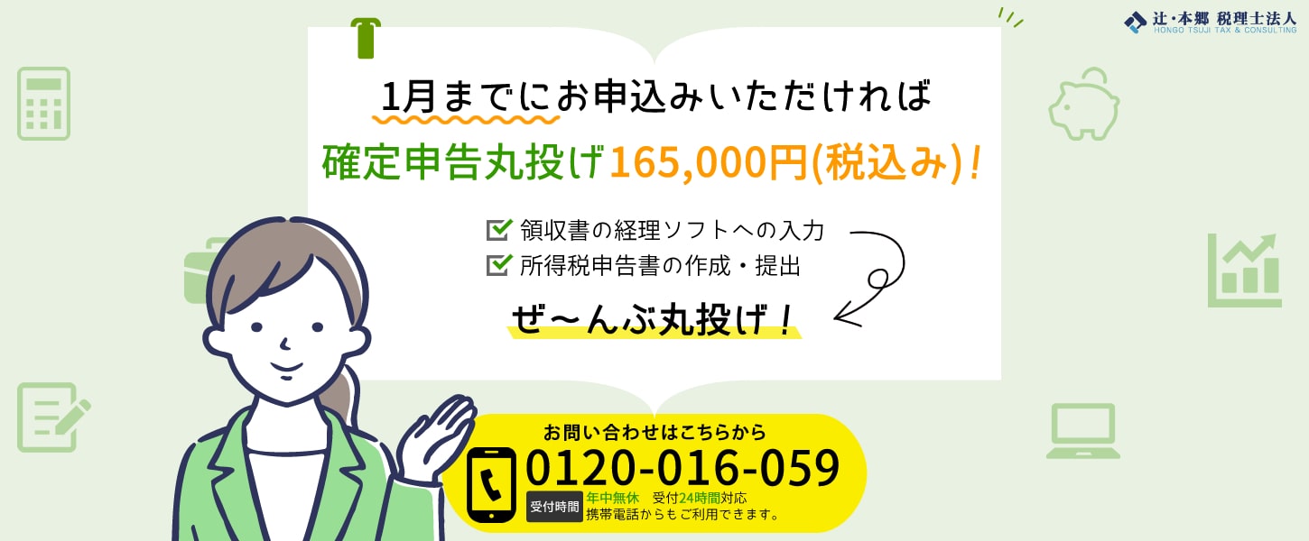 | 青色申告 | 通常300,000 円(税込み)~のところ 165,000 円(税込み)~ ※1月末までのご入金で